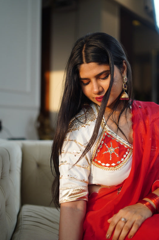 Red and Golden Aangi Blouse with Sequence and Gota Work