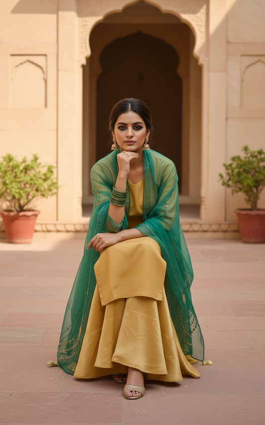 Golden Sharara Set with Organza Dupatta | Avantika | Ethnic Saroj
