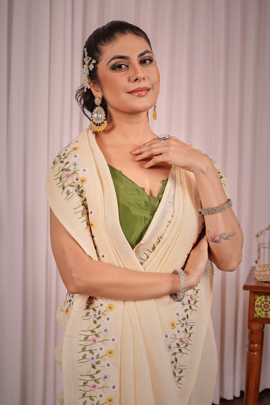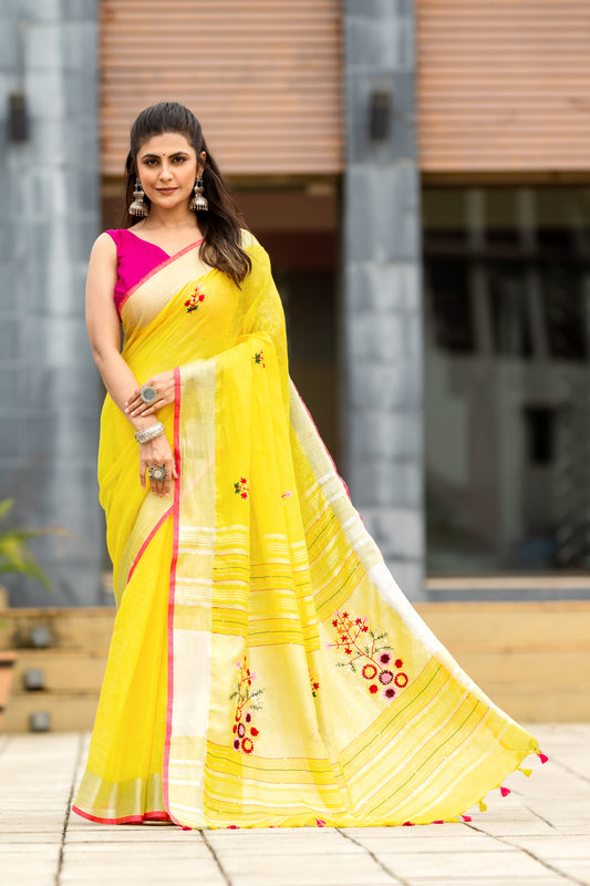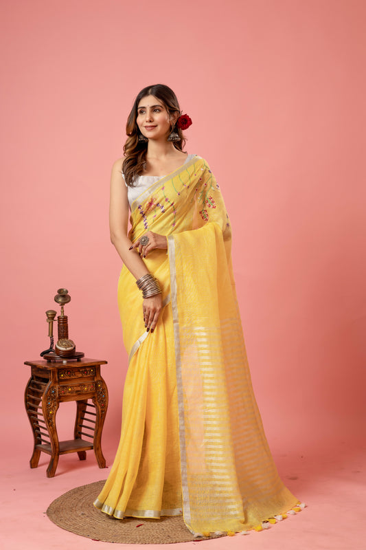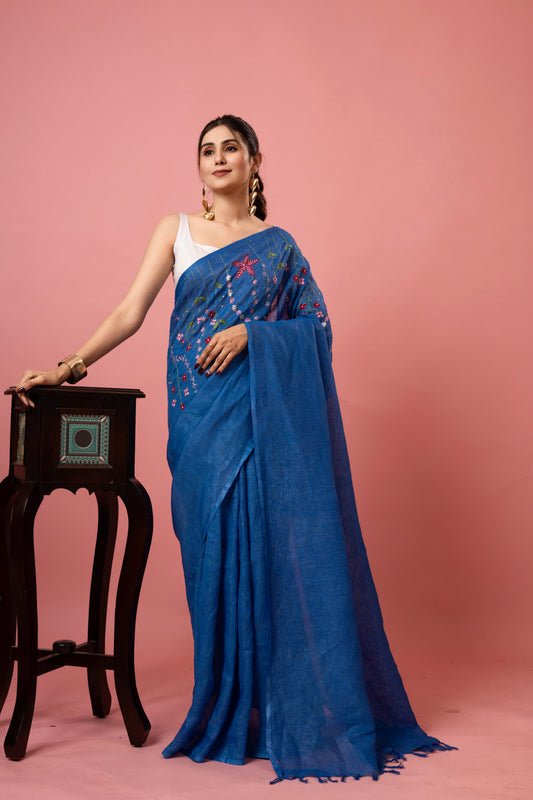 V I S H W A M R I T || Pure Linen Saree with Embroided Blouse