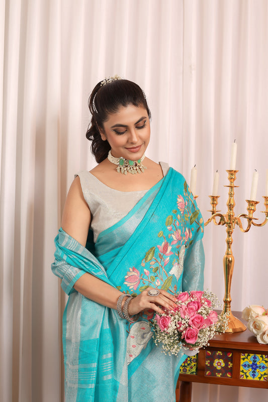 P A D M I N I || (Mint Green) Hand Painted Saree