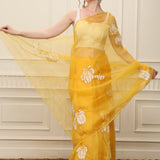 This exquisite Yellow Colour Organza Silk Saree is beautifully hand-painted and kut dana work with delicate white flowers, exudes timeless elegance.