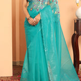 Our Blue Organza saree is a stunning blend of elegance and artistry, featuring delicate hand-embroidered floral patterns that add a touch of timeless beauty.