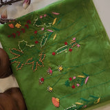 Our Green Organza saree is a stunning blend of elegance and artistry, featuring delicate hand-embroidered floral patterns that add a touch of timeless beauty.