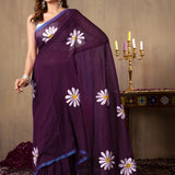 This Purple Hand-Painted Mull Cotton Saree, adorned with beautiful flower Motif, exudes a vibrant and artistic charm.