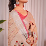 This Linen Saree is beautifully adorned with intricate Flower embroidery, showcasing timeless craftsmanship. The delicate motifs, inspired by traditional Indian art, bring a rich cultural essence to the fabric. The combination of linen's elegance and the detailed embroidery creates a unique, graceful look perfect for any special occasion.