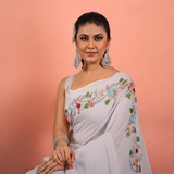 This Linen Saree is beautifully adorned with intricate art embroidery, showcasing timeless craftsmanship. The delicate motifs, inspired by traditional Indian art, bring a rich cultural essence to the fabric. The combination of linen's elegance and the detailed embroidery creates a unique, graceful look perfect for any special occasion.