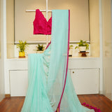 This vibrant Blue Mull Cotton Saree features a blend of bold hues, creating a lively and refreshing look.