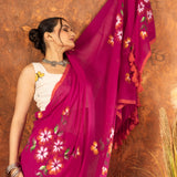 This Marron Hand-Painted Mull Cotton Saree, adorned with a graceful flower motif, exudes a vibrant and artistic charm.
