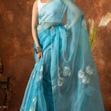 This exquisite Blue Colour Organza Silk Saree is beautifully hand-painted and hand work with delicate white flowers, exudes timeless elegance.