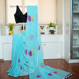 This Sky-Blue Hand-Painted Mull Cotton Saree, adorned with a graceful motif Lotus, exudes a vibrant and artistic charm.