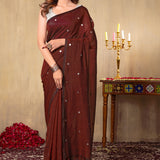 This Brown Mull Cotton Saree is a perfect blend of subtle elegance and intricate craftsmanship, featuring delicate sequence work that adds a touch of shimmer. The soft, breathable fabric and the graceful design make it a sophisticated choice for any special occasion.