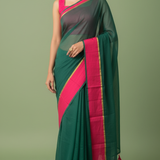 Green Mull Cotton Saree with Pink Border