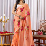 This Orange Hand-Painted Mull Cotton Saree, adorned with a graceful lotus motif, exudes a vibrant and artistic charm.
