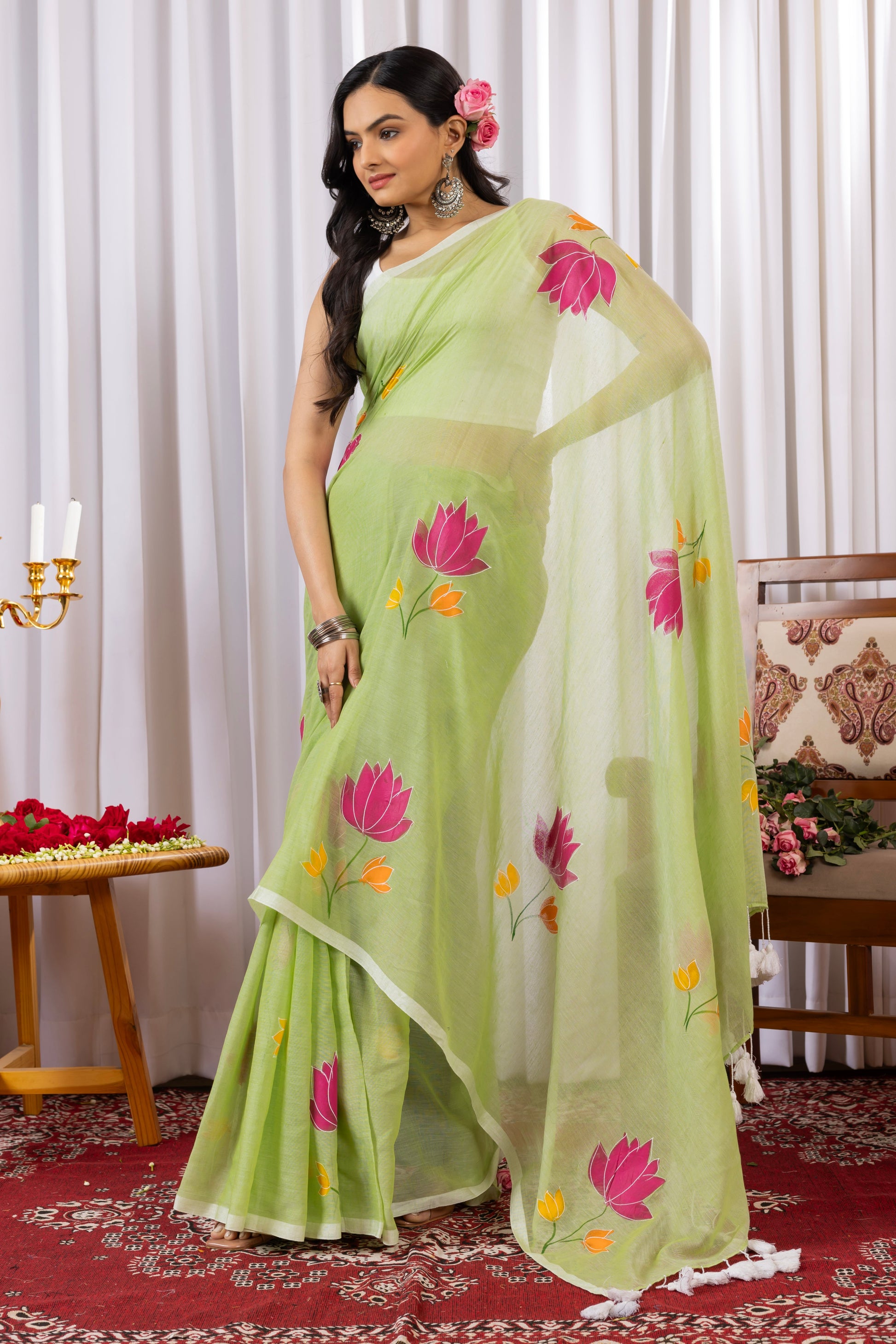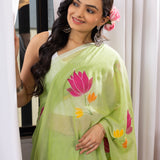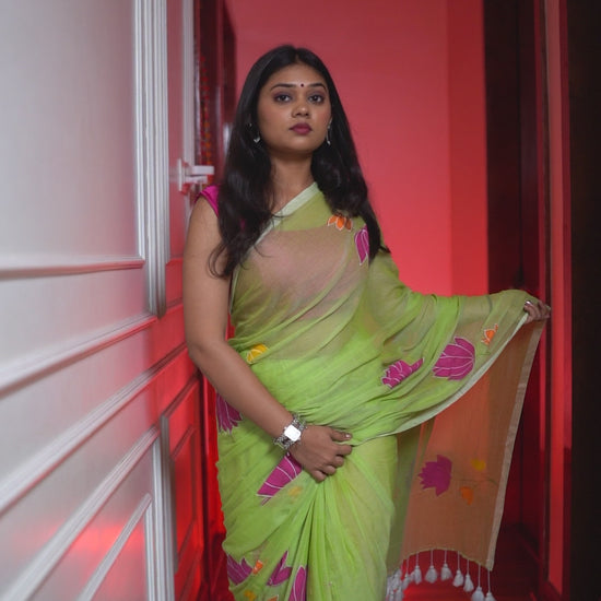 This light green Mull Cotton Saree, adorned with a graceful lotus motif, exudes a vibrant and artistic charm.