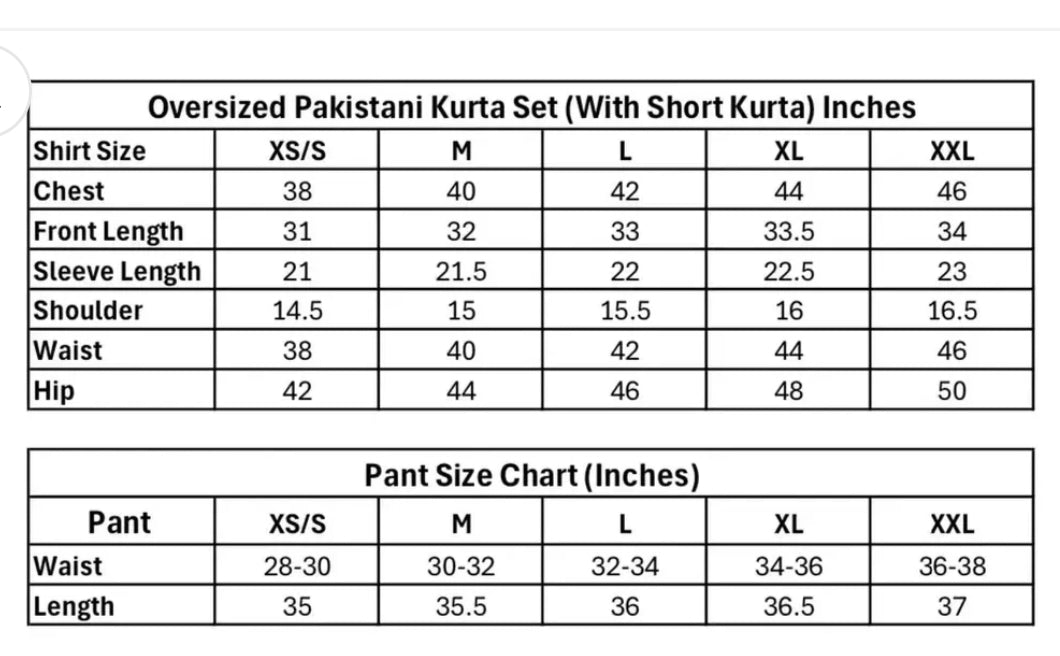 Size Chart - Regular size Kurta Set