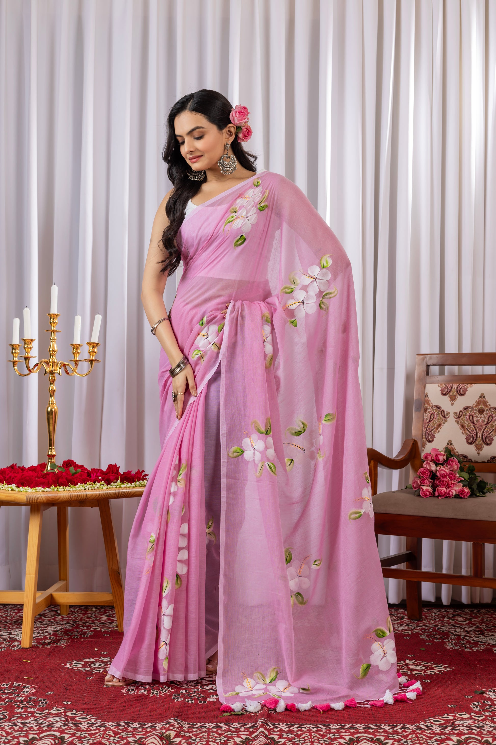A light pink mull cotton saree with hand painting exudes a fresh and vibrant charm, combining the natural softness of cotton with the artistry of hand-painted designs. The bright lime green base creates a lively backdrop for intricate, colorful motifs, making it an eye-catching piece. The lightweight fabric ensures comfort, while the hand-painted details add a unique, personalized touch. This saree is perfect for those who appreciate traditional craftsmanship with a modern twist.