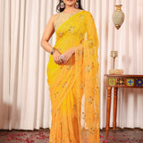 This Yellow Pure Chiffon saree is adorned with exquisite Jal work all over the body, creating a graceful and intricate design that exudes elegance. The delicate embroidery adds a touch of traditional craftsmanship, enhancing the soft flow and beauty of the saree. Its graceful drape and colorful appeal make it a perfect choice for festive events.