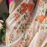 This is a Semi Tusar Silk Saree , with Intricate Floral Embroidery all over the Body.