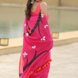 This Pink Hand-Painted Mull Cotton Saree, adorned with a graceful Owl motif, exudes a vibrant and artistic charm.