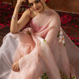This exquisite Peach Colour Organza Silk Saree is beautifully hand-painted with delicate white flowers, exudes timeless elegance.