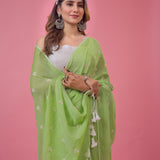 This vibrant light green saree with Shiuli embroidery flower features a blend of bold hues, creating a lively and refreshing look.