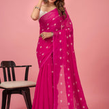 This vibrant pink saree with Shiuli embroidery flower features a blend of bold hues, creating a lively and refreshing look.