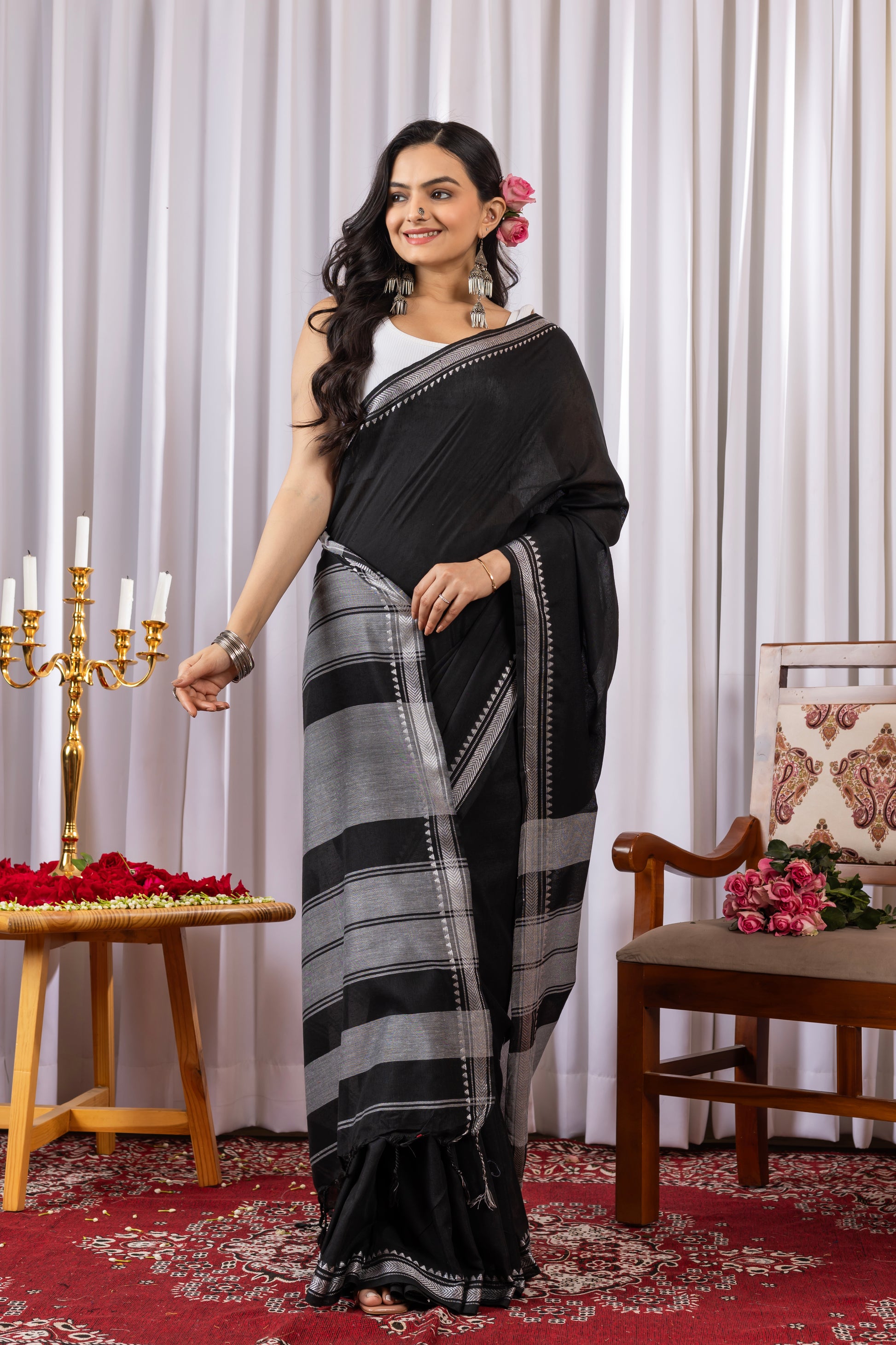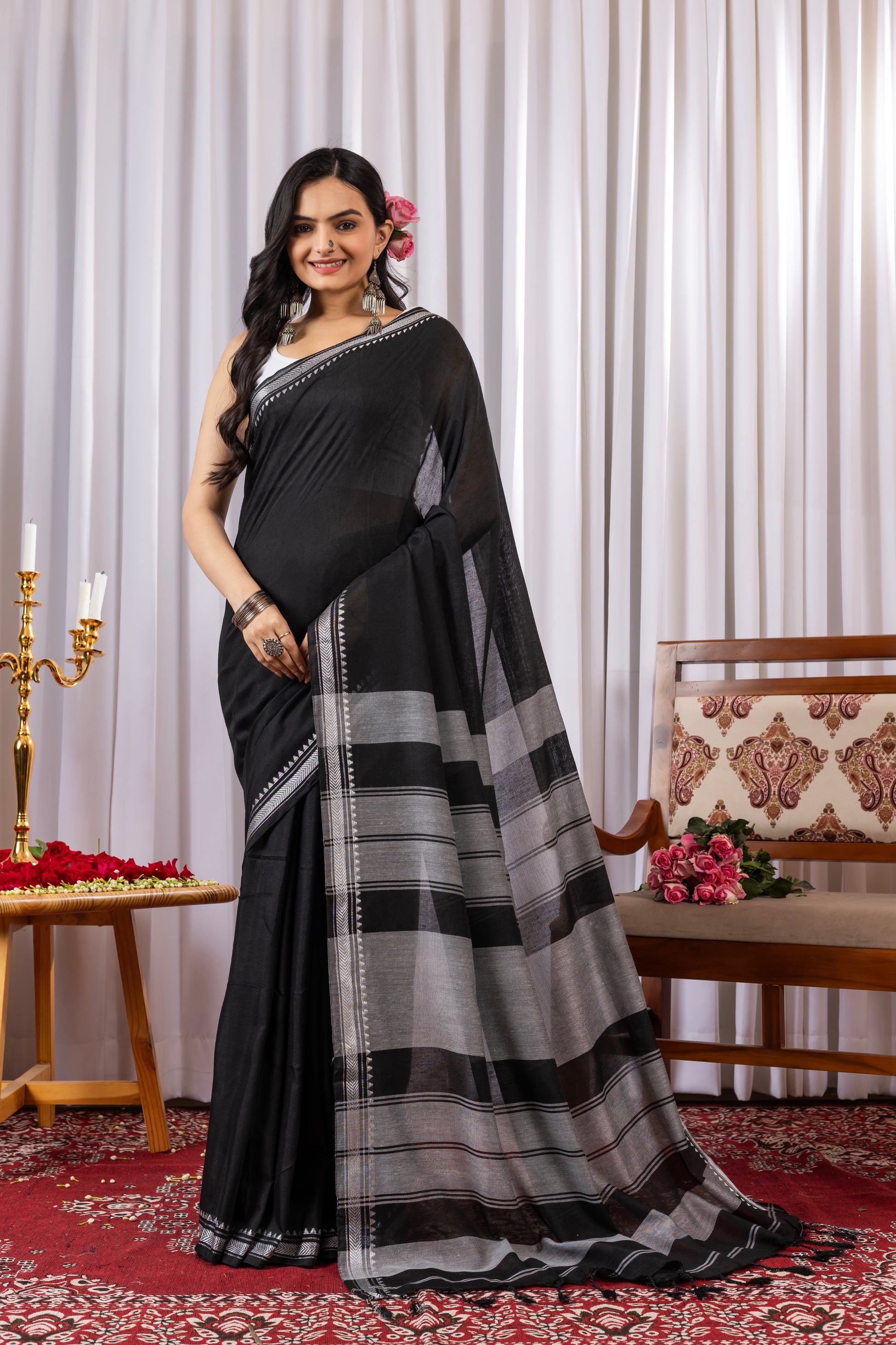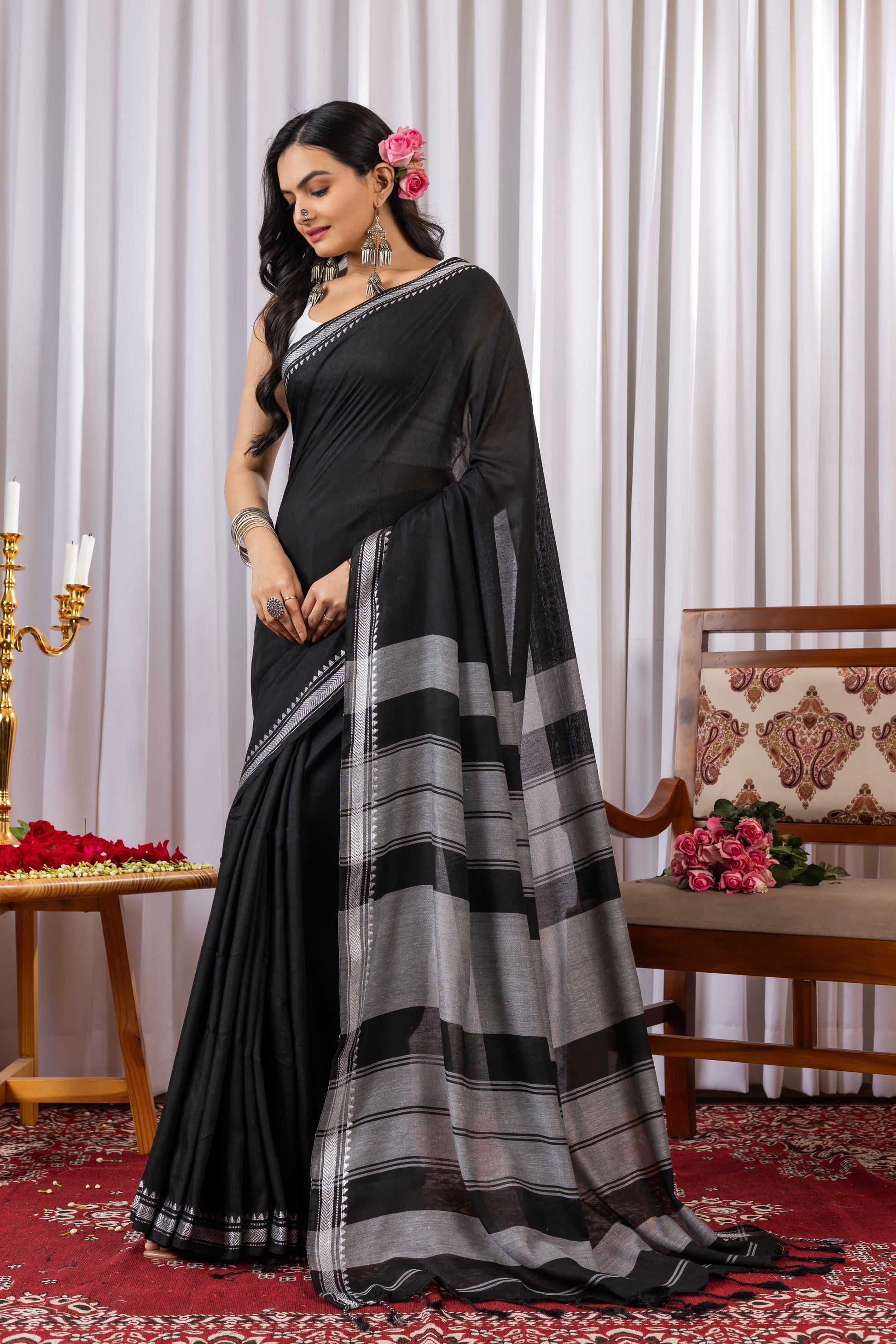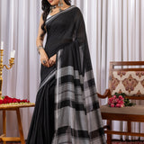 Black Cotton Saree with White Border