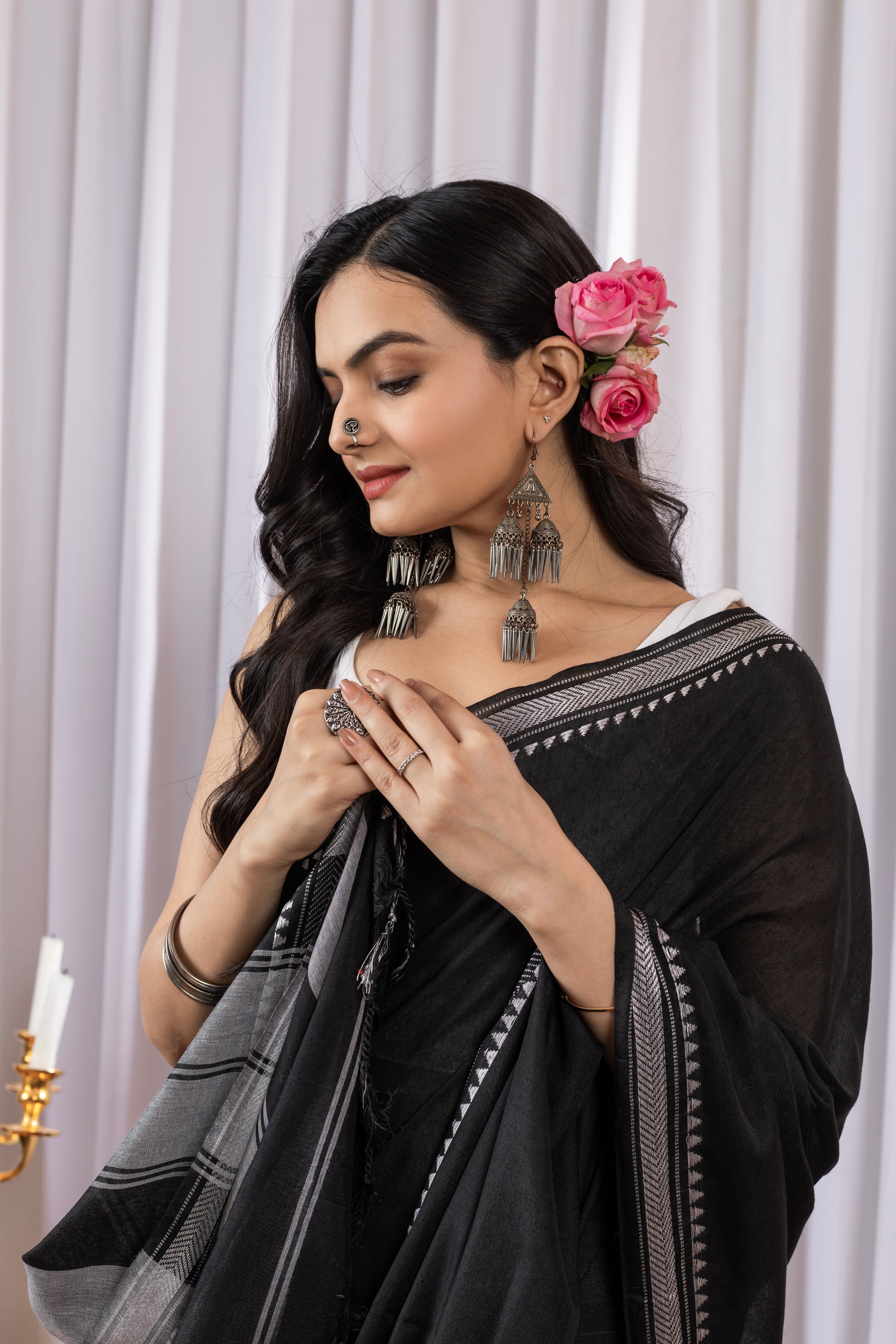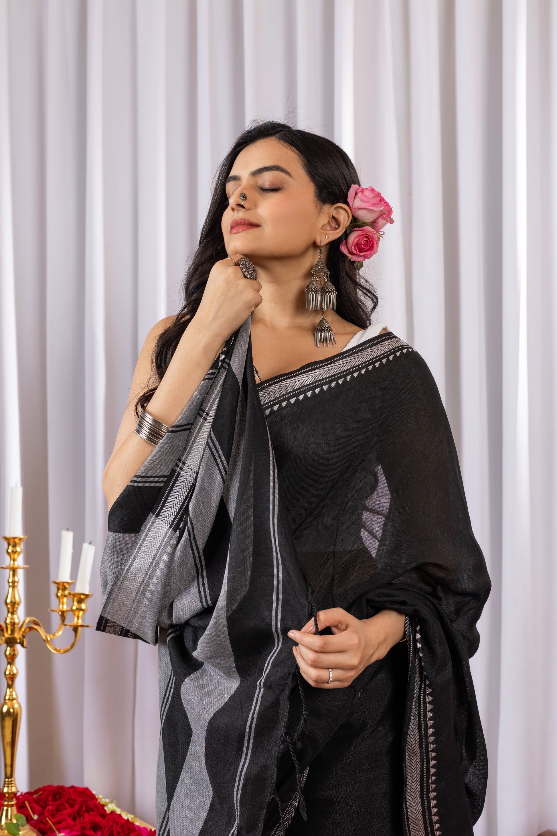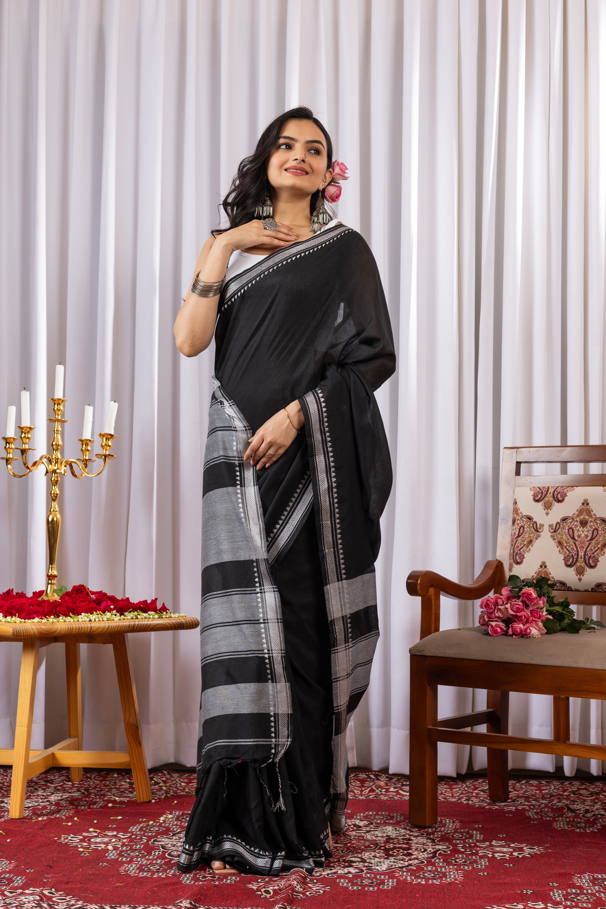 Black Cotton Saree with White Border
