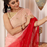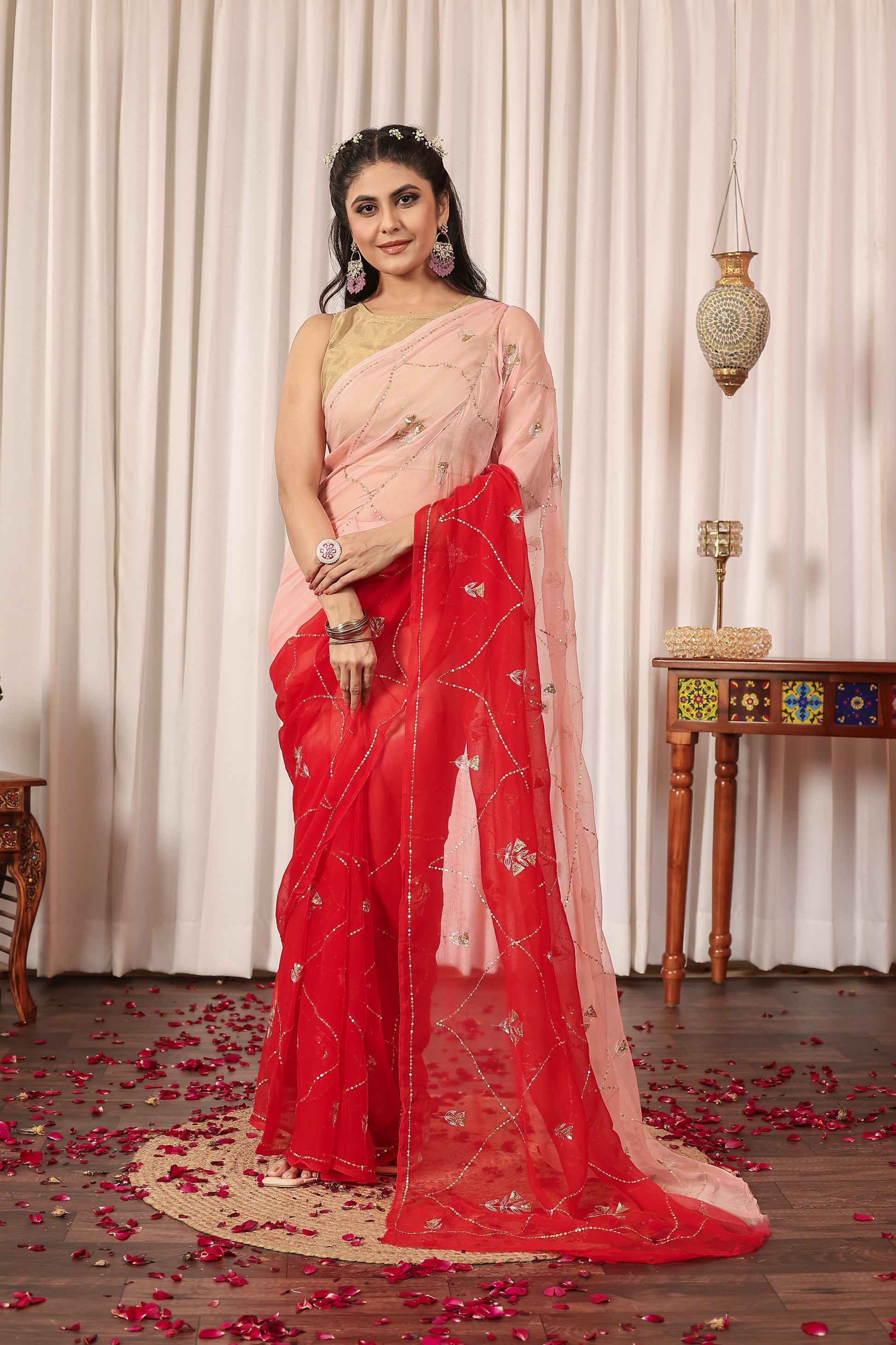 This Red and peach Pure Chiffon saree is adorned with exquisite Jal work all over the body, creating a graceful and intricate design that exudes elegance. The delicate embroidery adds a touch of traditional craftsmanship, enhancing the soft flow and beauty of the saree. Its graceful drape and colorful appeal make it a perfect choice for festive events.