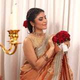 This Bannarasee Tissue Saree radiates royal elegance with its rich texture and intricate Zari work. The shimmering fabric and timeless design make it a perfect choice for grand celebrations and festive occasions.