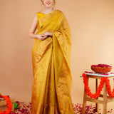 This Bannarasee Tissue Saree radiates royal elegance with its rich texture and intricate zari work. The shimmering fabric and timeless design make it a perfect choice for grand celebrations and festive occasions.