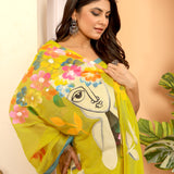 A lime green mull cotton saree with hand painting exudes a fresh and vibrant charm, combining the natural softness of cotton with the artistry of hand-painted designs. The bright lime green base creates a lively backdrop for intricate, colorful motifs, making it an eye-catching piece. The lightweight fabric ensures comfort, while the hand-painted details add a unique, personalized touch. This saree is perfect for those who appreciate traditional craftsmanship with a modern twist.